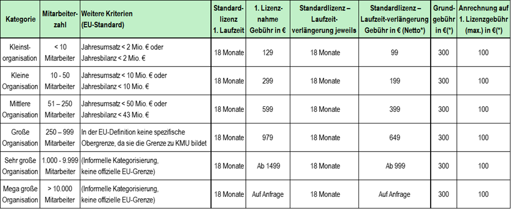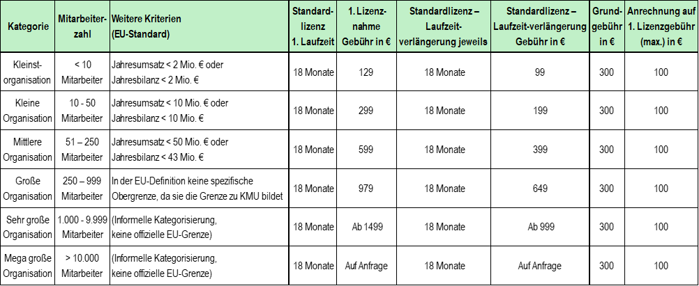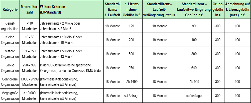 - Kategorie der Organisation gemäß Tabelle „V. Lizenzgebührenübersicht“: